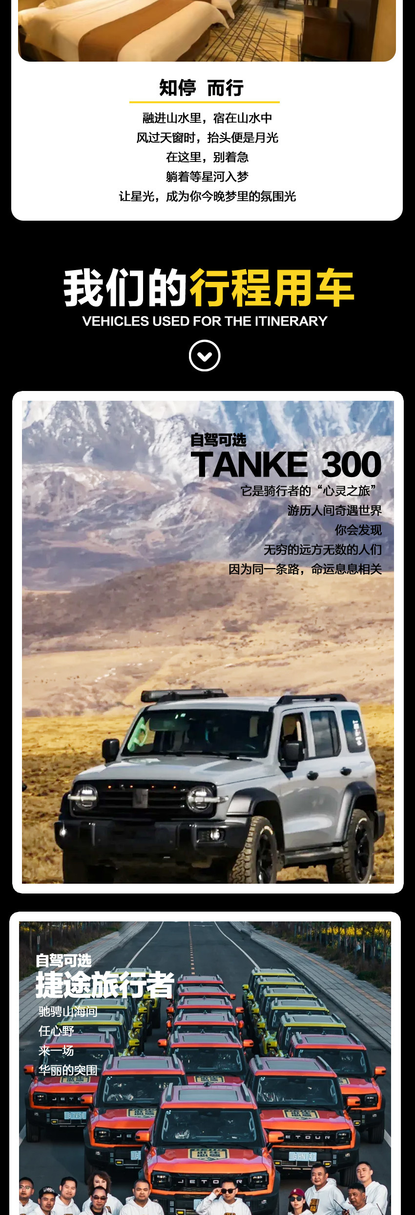 1.交通:2-5人小团,根据人数确定车辆(全程司机兼向导,已含驾驶员住宿、油费、过路费,驾驶员熟悉线路,会给队员提供行程建议,边走边玩,保证多次停车服务,但不会像专业导游一样解说,且不陪同队员进景区,请理解);2-4位队员乘坐5座SUV/越野;5位队员乘坐7座商务车;油车/电车随机安排、散客拼团不能指定车型,随车配备无人机或者单反相机;车贴,对讲机。