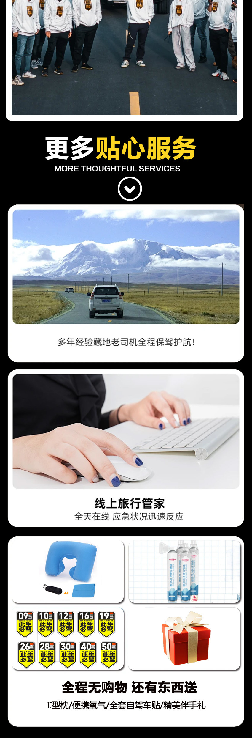 出行无忧:全车随车基本公用药品(只包含外用药,口服药及特殊药物请根据自身情况提前自备)及车用应急工具;